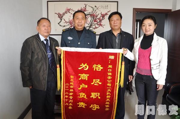 2012年10月24日,周口市保安服務(wù)公司喜氣洋洋,掌聲一片,人防新天地崗點(diǎn)“簾林珍奇”店主李永春向公司送來錦旗,對新天地保安認(rèn)真負(fù)責(zé),為商戶保駕護(hù)航的工作精神給予肯定。